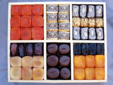 Chocolate Covered Blenheim Apricots, Sugar Plums made with a mixture of dried fruit, honey, nuts, and Almond Topped Coconut Date-Nut Rolls.