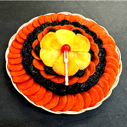 Dried Fruits: Blenheim Apricots, Pears, Yellow Peaches, French Plums, and Glace Cherry Garnish on Round Wicker Plate.